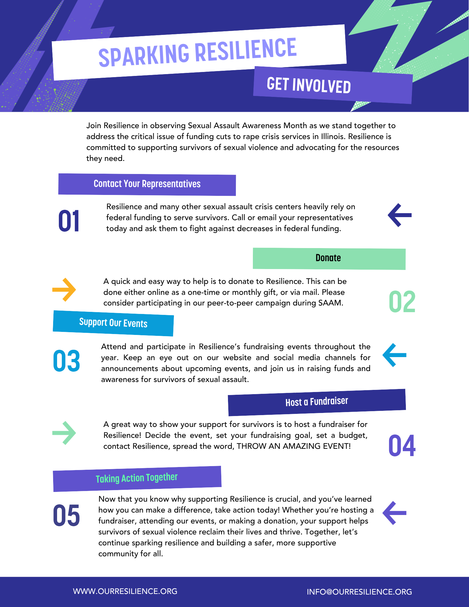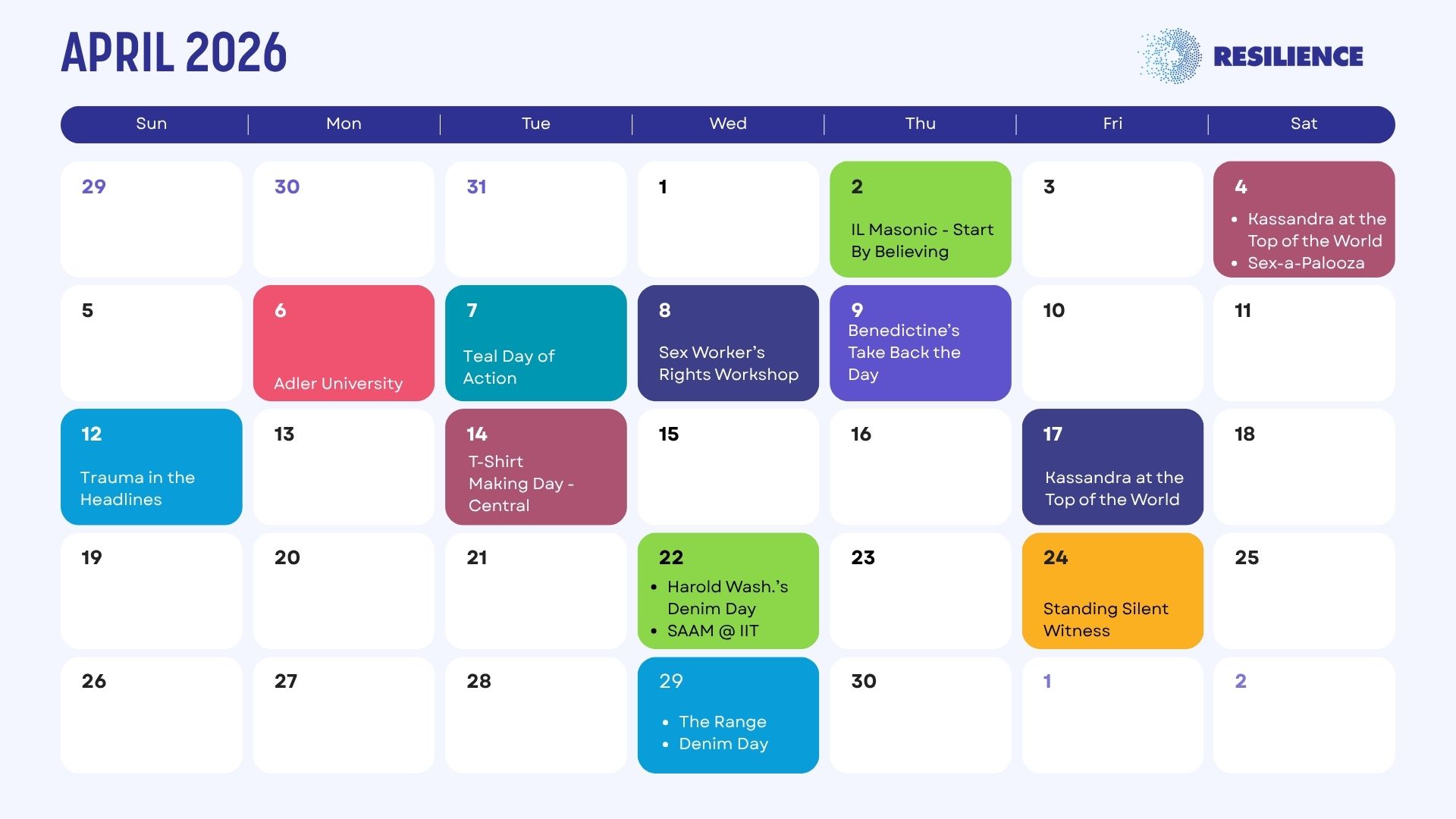 Join us in kicking off Sexual Assault Awareness Month by participating in the SAAM Day of Action! Wear teal on April 1st to show your support for survivors of sexual violence and raise awareness in your community. Whether online or in person, your participation helps amplify the voices of those impacted and brings attention to the importance of prevention and support. Share your teal photos, stories, and messages on social media using the hashtags #SpeakLoudStandProud, #WeRiseTogether, #JoyInResistance. #FightingTogether, #ResilientTogether, and tagging @ResilienceChi to help spread the word and inspire others to take action.Â